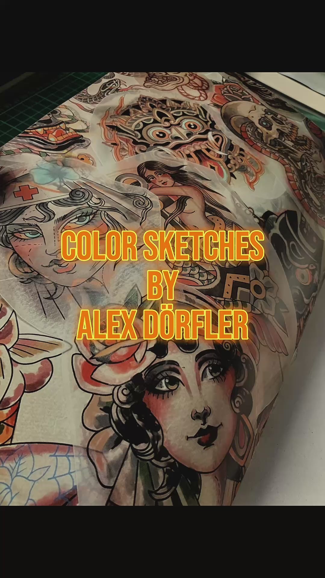 – Full-color sketches of tattoo designs, all of them already tattooed